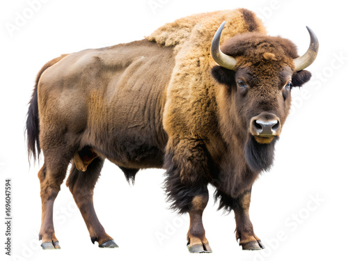 Majestic bison standing tall, isolated on transparent background, showcasing its powerful physique and impressive horns in a captivating portrait