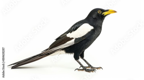 bird, black, white, yellow, beak, standing, isolated, background, animal, wildlife, nature, feather, avian, ornithology, wild, fauna, eye, foot, magpie, crow, raven, songbird, passerine, studio, cut-out, half face, full-length, alert, curious, observing