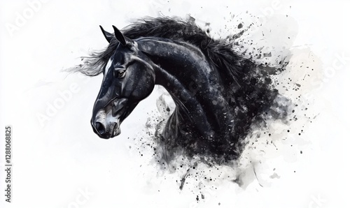 horse, black horse, portrait, watercolor, splash, dynamic, movement, equine, wildlife, nature, art, illustration, creativity, beauty, strength, elegance, head shot, detailed, realistic, modern art, equestrian, print, home decor, design, photo, animal portrait, fine art, horse racing, fast horse, mane, powerful, graceful