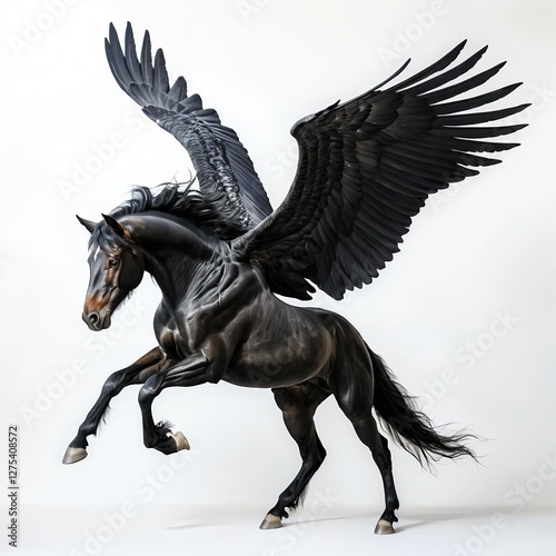 pegasus, black horse, fantasy, mythology, creature, magical, majestic, powerful, elegant, grace, wing, black, dark, fast horse, animal, equine, fantasy art, white background, isolated, power, beauty, mythical, legend, flight, fly up