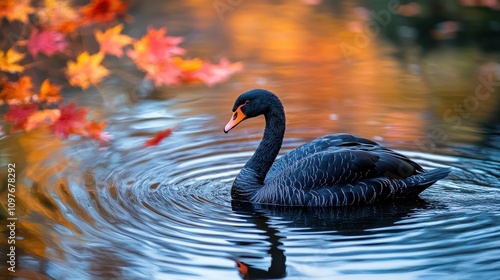 Majestic Black Swan Gracefully Gliding on Reflective Autumn Lake Surrounded by Vibrant Foliage