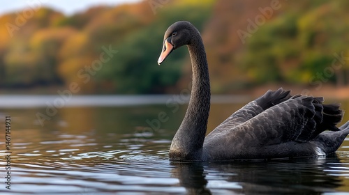 Majestic black swan on tranquil lake. Autumnal backdrop
