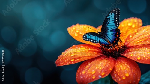 Majestic blue butterfly on vibrant orange flower with water droplets, bokeh background