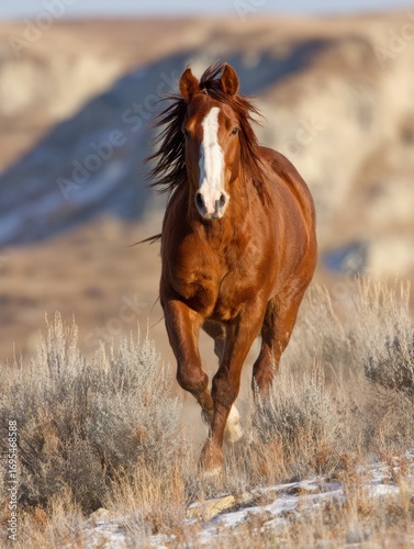 Majestic Brown Horse Galloping Across the Open Landscape During the Golden Hour With Serene Hills in the Background