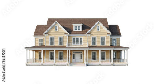 house, colonial, revival, farmhouse, yellow, veranda, architectural, photorealistic, white, american, home, ownership, pristine, 2, story, building, residential, structure, clapboard, siding, buttery, trim, window, shingle, roof, column, balustrade, visualisation, render, studio, evacuated, clean, minimal, isolated, floating, high key, sharp, sharpened, perspective, symmetric, luxury, conceptual, property, ideal