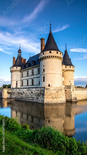 castle, fosse, dawn, tower, stone, architecture, europa, france, historic, grand, beauty, peace, serene, sky, cloud, water, landscape, morning, light, building, old, grandiose, mediaeval, travel, vacation, tour tourism, imposing, exterior, still