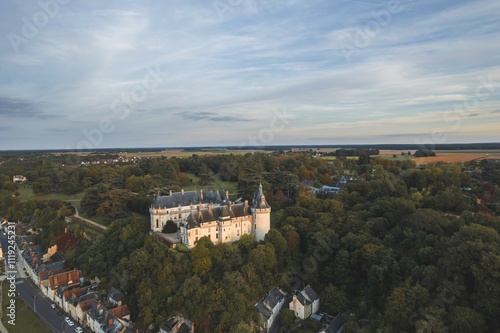 Majestic castle perched atop a lush hill under a serene sky at sunset near a quaint village
