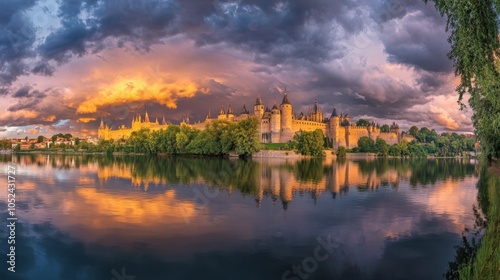 Majestic Castle Reflection at Sunset Over Water