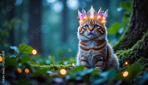 Majestic cat wearing crystal crown in enchanted forest, magical allure