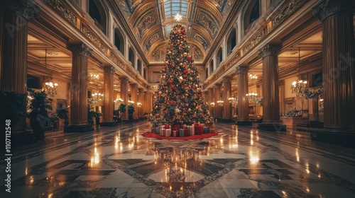 christmas, tree, decoration, ornament, present, gift, holiday, light, elegance, architecture, indoor, celebration, festive, colours, tradition, gathering, joy, beauty, winter, marble, luxury, design, atmosphere, cheer, seasonal, cosy, warmth, lobby, shine, sparkle, greenery, community, family, mood, charme, happiness, event, nostalgia, winterly
