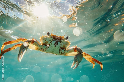 Majestic crab suspended in crystalclear water with sunlight filtering from above