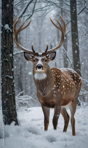 Majestic deer in snowy forest, intricate antlers, serene atmosphere