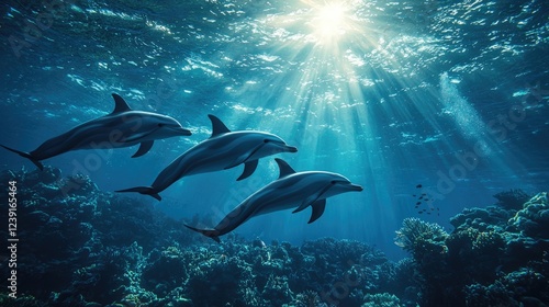 Majestic Dolphins Grace the Ocean's Depths, Sunlight Beams Illuminate Underwater Paradise