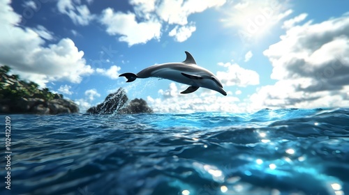 dolphin, ocean, water, jump, leap, splash, sea, marin, wildlife, nature, blue, sky, cloud, sun, wave, tropical, scenic, summer, beach, coast, shore, sunshine, seascape, landscape, environment, animal, mammal, underwater, adventure, explore, freedom, joy, energy, dynamic, motion, playful, aquatic, oceanic, marine life, water, cerulean, turquoise, sapphire, nautical, maritime, coastal