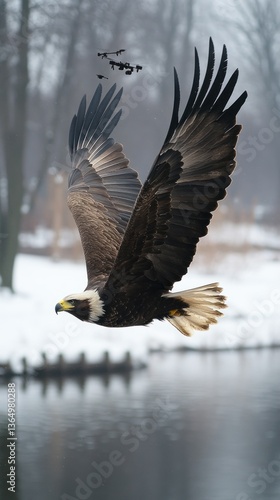 eagle, bird, flight, soaring, winter, snow, wildlife, nature, predator, majestic, powerful, wing, feather, talon, beak, eye, landscape, scenery, avian, fauna, animal, environment, wilderness, freedom, beauty, power, grace, elegance, sky, cloud, tree, water, river, duck pond, glacé, cold, vertebrate, bird of prey, bird of prey, hunt, huntress, animal kingdom, wild, outdoors