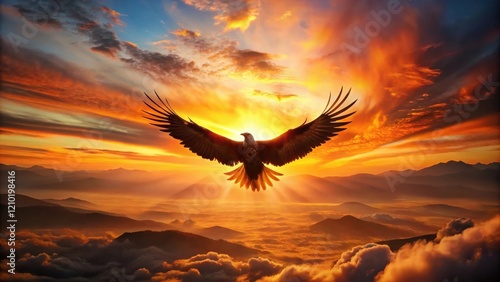 eagle, bird, wing, sunrise, sunset, mountain, sky, cloud, majestic, freedom, power, nature, wildlife, avian, flight, gold, light, ray, hope, inspiration, beauty, landscape, scenic, breathtaking, vibrant