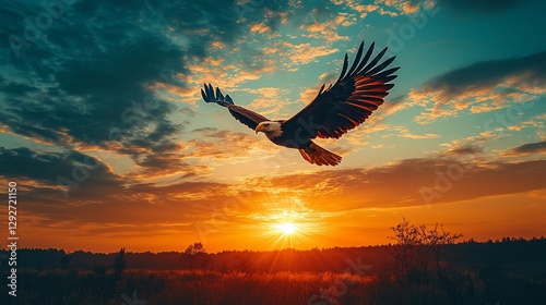 eagle, sunset, sunrise, bird, flight, sky, cloud, nature, wildlife, freedom, power, majestic, wing, animal, bird of prey, avian, soaring, predator, wild, beauty, gold, orange, colours, landscape, horizon, scene, day, sun, light, air, high, up high, view, huge, expansive, dramatic, vibrant, intense, powerful, magnificent, impressive, breathtaking, spectacular