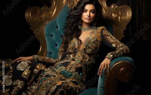 Majestic Elegance of Indian Queen Seated on Opulent Armchair Reflecting Royal Lineage