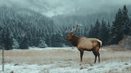 elk, cervid, wildlife, winter, snow, forest, evergreen, nature, animal, mammal, wild, peaceful, serene, tranquil, landscape, outdoors, cold, mountain, horn, antler, brown, blue, white, muted, field