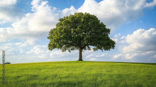 Majestic English oak tree standing alone in a vast green field under a cloudy sky, Lincolnshire, England.