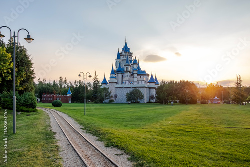 Majestic Fairytale Castle located in Sazova Science, Culture and Art Park, Eskişehir. A magical structure with blue towers, ideal for fantasy, travel, and architecture-themed visuals. Eskişehir Turkey
