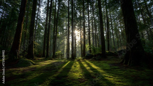 Majestic forest scene showcasing tall trees reaching towards the sky with sunlight streaming through the canopy, casting long shadows on the moss-covered forest floor.