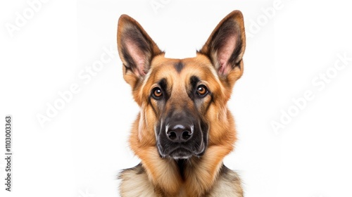 Majestic German Shepherd portrait against a clean white backdrop highlighting the dog's noble features and expressive eyes.