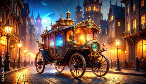carriage, fairy tale, fantasy, town, city, night, street, cobbled, gold, majestic, regal, magical, enchanting, atmosphere, light, lamp, building, architecture, fantasy art, evening, night scene, royals, elegant, vintage, romantic, dreamy, mysterious, wonder, magic, illustration, artwork, digital artwork, storybook, picturesque, charming, beautiful, stunning