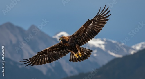 Majestic golden eagle soars gracefully against a backdrop of snow-capped mountains and clear blue sky, embodying freedom and wild beauty.