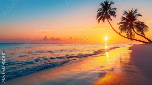 sunrise, beach, palm tree, sea, wave, horizon, silhouette, tranquil, nature, gold, landscape, tropical, morning, paradise, serenity, coastal, vacation, beauty, sky, warm, sunlight, peaceful, idylli, relaxation, holiday, scenery, ocean, summer, bright, dawn, travel, shore, exploration, vibe, tropical paradise, calm, picturesque, golden hour, warm colors