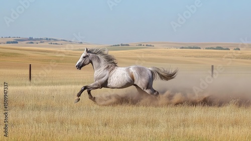 Majestic Gray Horse Galloping Through Golden Grasslands Under Blue Sky in Outdoor Pasture Scene