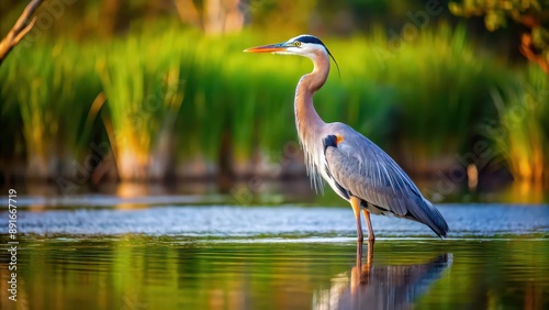 Majestic great blue heron standing in shallow water, wildlife, bird, nature, heron, water, majestic
