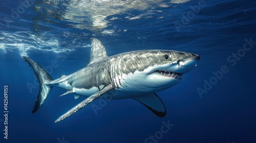 Majestic Great White Shark Swimming in the Deep Blue Ocean, Up Close View