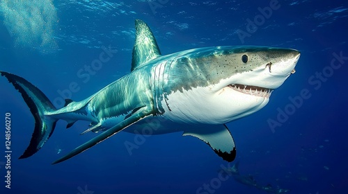 Majestic Great White Shark Underwater: A breathtaking close-up of a great white shark swimming in the deep blue ocean. Witness the power and beauty of this magnificent predator in its natural habitat.