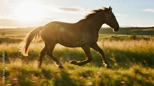 Majestic horse galloping through a meadow, embodying freedom and wild beauty in golden light.