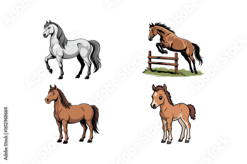 horse, equine, animal, wildlife, nature, equestrian, jumping, foal, adult, grey, brown, clip art, vector, illustration, farm, field, fence, grass, movement, grace, power, domestic animals, mammal, farm animal, riding, sport, competition, stylised, cartoon, graphic, artwork, drawing, creative, design, visual, representation, collection, set, multiple