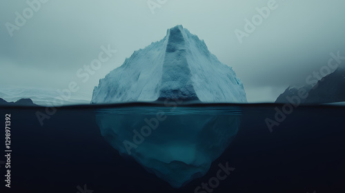 Majestic iceberg floating in the cold Arctic waters, its towering crystalline structure reflecting in the still ocean. Ideal for environmental campaigns, climate change discussions, and nature photos