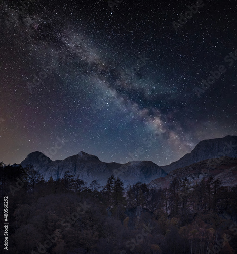 Majestic landscape image of stunning Autumn sunset light across Langdale Pikes looking from Holme Fell in Lake District