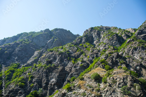 Majestic landscape of the mountains and forest in Caucasus at summer. Dramatic sky with clouds.