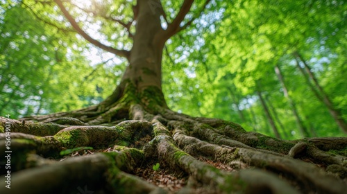 Majestic large tree with extensive roots and lush green leafy forest background.
