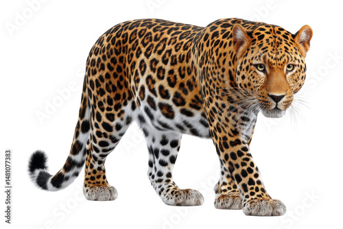 Majestic Leopard: A powerful and majestic leopard, showcasing its striking spotted coat and intense gaze, stands poised against a white background.