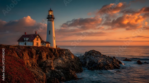 lighthouse, majestic, tall, rocky, coast, sunset, bright, light, shining, calm, ocean, sky, beautiful, gradient, orange, yellow, blue, peaceful, inspiring, coastal, scene, landscape, photo, photorealistic, nature, scenery, sea, water, beach, shore, beacon, tower, building, architecture, historic, old, vintage, romantic, dramatic, colourful, vibrant, serene, tranquil, safe, guide, hope, travel, destination