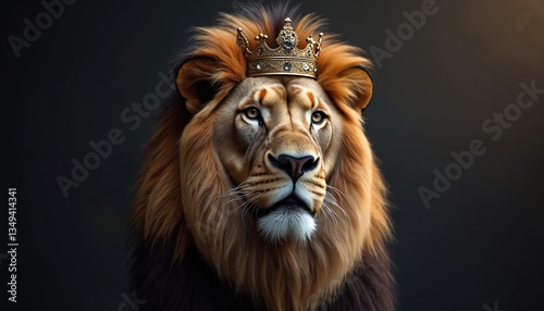 Majestic lion portrait wears crown against dark background. King animal, symbol of power, royalty, strength, pride. Regal beast with golden crown evokes strength. Cinematic wallpaper.
