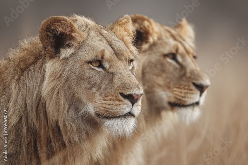 Majestic lions resting in tall grass during a golden sunset in the African savanna