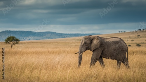 Majestic Lone Elephant Strolling Through the Vast African Grassland of Masai Mara, Kenya