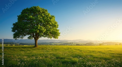 Majestic Lone Tree in Sunlit Meadow - Serene Landscape Photography