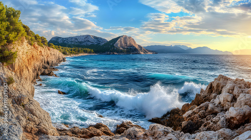 Majestic Mediterranean Seascape with Rugged Coastline and Dynamic Turquoise Waves Splashing