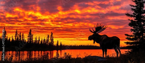 moose, silhouette, sunset, lake, orange, red, sky, cloud, landscape, nature, wildlife, animal, dusk, evening, tranquil, serene, peaceful, dramatic, scenic, outdoors, wilderness, forest, tree, water, mammal, antler, majestic, powerful, beauty, calm, environment, horizon, picturesque, panorama, twilight, gold, light, shadow, dark, scenic view, natural beauty, outdoor recreation