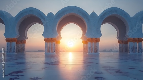 mosque, arch, sunrise, sunset, architecture, islamic, religion, islam, muslim, faith, spirituality, dome, column, pillar, gold, white, marble, stone, building, structure, design, pattern, detail, ornate, elegant, grand, majestic, beautiful, scenic, view, landscape, horizon, sky, light, sun, dawn, dusk, tranquil, peaceful, serene, floor, tile, intricate, craftsmanship, artistry