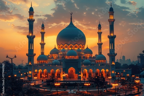 mosque, sunset, islamic, architecture, minaret, dome, light, illuminated, beautiful, religion, prayer, faith, spirituality, islam, muslim, culture, heritage, building, grand, majestic, serene, peaceful, tranquil, evening, twilight, sky, cloud, orange, gold, night, scene, landscape, city, urban, horizon, design, ornate, detail